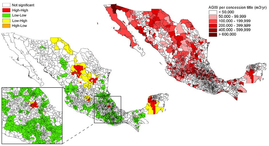 Local information on the availability of ground- and surface water is essential for the allocation of water resources. In Mexico, groundwater titles granted by the National Water Commission are key to ensuring future availability of water for multiple human and ecosystem needs. The relationships between ground and surface water used in agriculture vary widely between municipalities. Municipality-scale spatial data make it possible for policy makers to decide if over-exploitation of groundwater can be addressed through reallocations of concessions or must be limited by demand management. These maps from IAI-supported research show critical clusters of municipalities where demand management is needed based on (freely available) municipality-scale water resource data combined with other social, economic and environmental data.