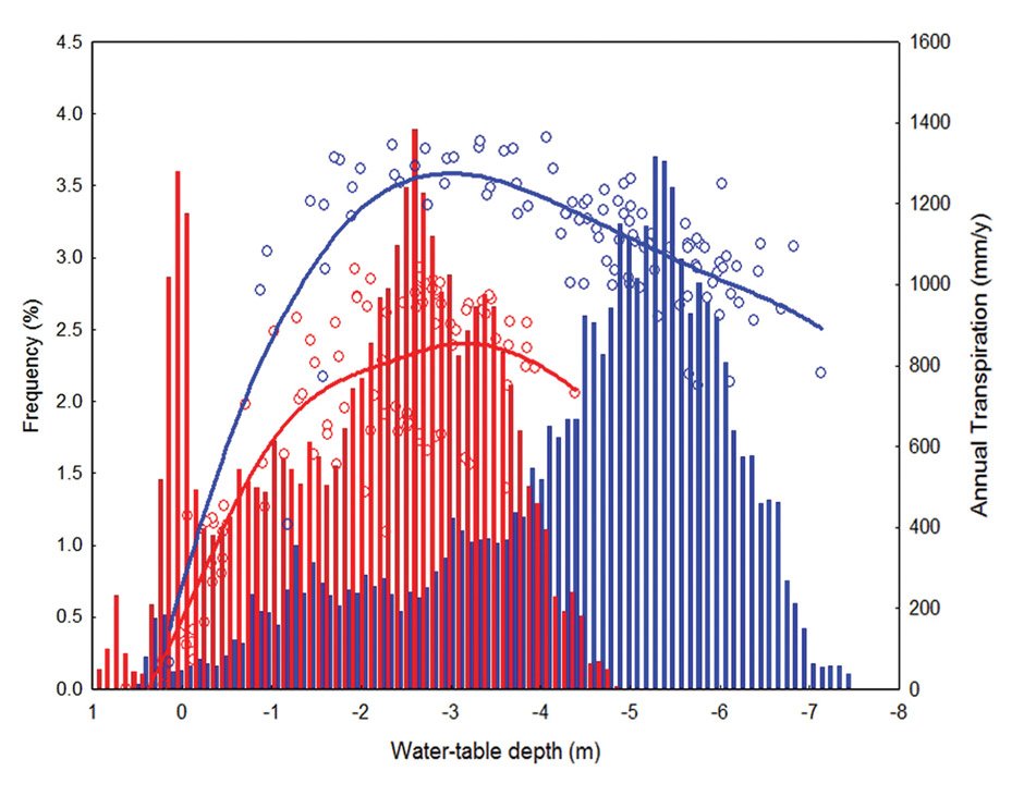 This figure shows annual transpiration rates in the Argentinean Pampas (circles and lines) under two land uses: perennial alfalfa pasture, widespread until the early nineties, and annual wheat-soybean-maize rotations, the dominant land use today. Transpiration rates (right-hand axis) are higher under pastures than under annual crops (1200 vs. 800 mm/year, on average). A 100-year simulation of the depth to the ground water-table under these regimes of evapotranspiration is shown by the bars whose height indicates how often in these 100 years a given groundwater level is reached (frequency on the left-hand axis). The model shows that pastures maintain ground water tables more commonly at greater depths (average -4.4 vs. -2 m) and result in less frequent flooding (2 vs. 47 events).