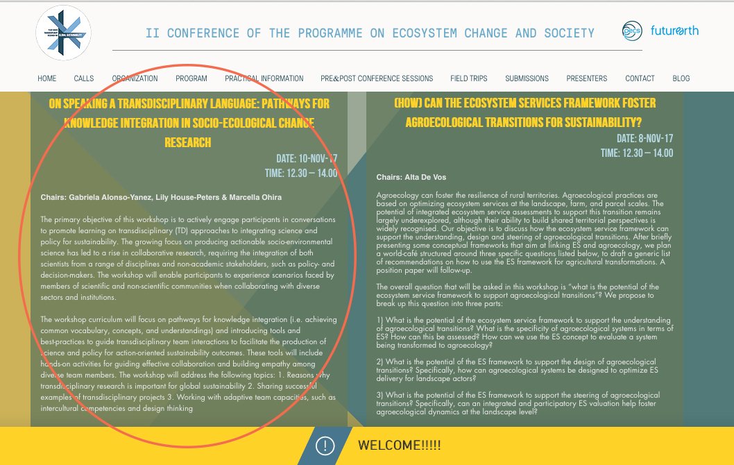 El programa del taller se concentrará en los caminos para la integración del conocimiento (a saber, uso de un vocabulario, conceptos y entendimientos comunes) y en la presentación de herramientas y buenas prácticas para guiar las interacciones en grupos transdisciplinarios para facilitar la producción de ciencia y política para lograr resultados orientados a la acción por la sostenibilidad. Estas herramientas incluirán actividades práctivas pra guiar una cooperación efectiva y desarrollar la empatía entre los miembros del equipo.