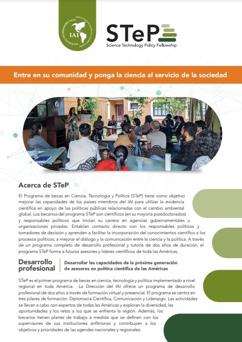 El Programa de Fellowship de Ciencia, Tecnología y Políticas (STeP) es un programa innovador de referencia del IAI con el fin de mejorar las capacidades humanas e institucionales en países miembros del IAI y apoyar la provisión de asesoramiento científico a los responsables del desarrollo de políticas públicas pertinentes al cambio global.