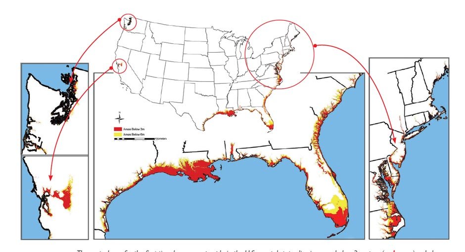 The map shows for the first time how many people in the U.S. coastal states live in areas below 3 meters (red areas) or below 6 meters (yellow areas) above sea level. The resulting table on the next page specifies for each state the population that lives in the 3 meter range (red figures) or, alternatively, that lives within 1 km from the coast. The state’s names are abbreviated. Combined values for all 23 coastal states of the U.S. are given in the box at the bottom.