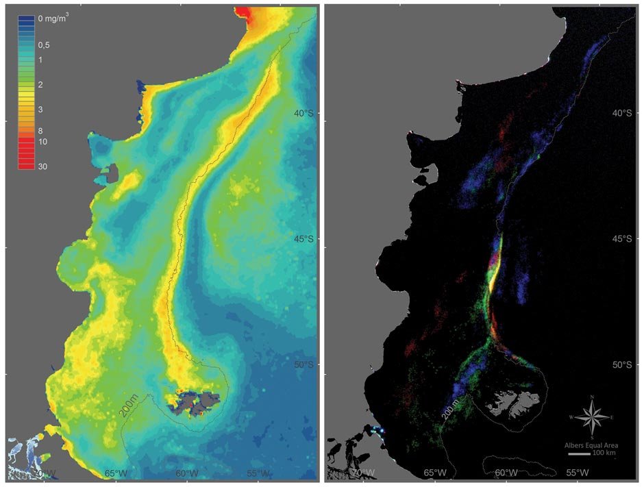 Above are two pictures of the Patagonian ocean shelf in the Western South Atlantic. The one on the left shows summer concentrations of surface chlorophyll-a (in milligram per cubic meter of ocean water; estimated from data collected by SeaWiFS, a satellite-borne radiometer), with the yellow and red colors indicating where oceanic biomass is high. The picture on the right shows nighttime lights in the same part of the southwestern Atlantic. The lights are color-coded for three different years: 1995 (blue), 2000 (green) and 2008 (red). These lights along the Patagonian shelf break are generated by ships fishing squid at night.