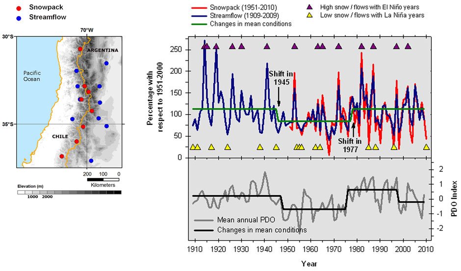 El gráfico muestra la capa de nieve invernal (línea roja) y los caudales fluviales (línea azul) en los Andes de Chile y Argentina entre 30 y 37° S, medidos en las estaciones indicadas en el mapa de la izquierda. En los años El Niño (triángulos morados) la cantidad de nieve y los caudales son altos, y lo contrario sucede en los años La Niña (triángulos amarillos). La línea verde muestra los caudales medios para los períodos 1910-1944, 1945-1976 y 1977-2010. Los cambios en el caudal promedio coinciden con los de la Oscilación Decenal del Pacífico (por sus siglas en inglés PDO, gráfico inferior), en las décadas 1940 y 70.