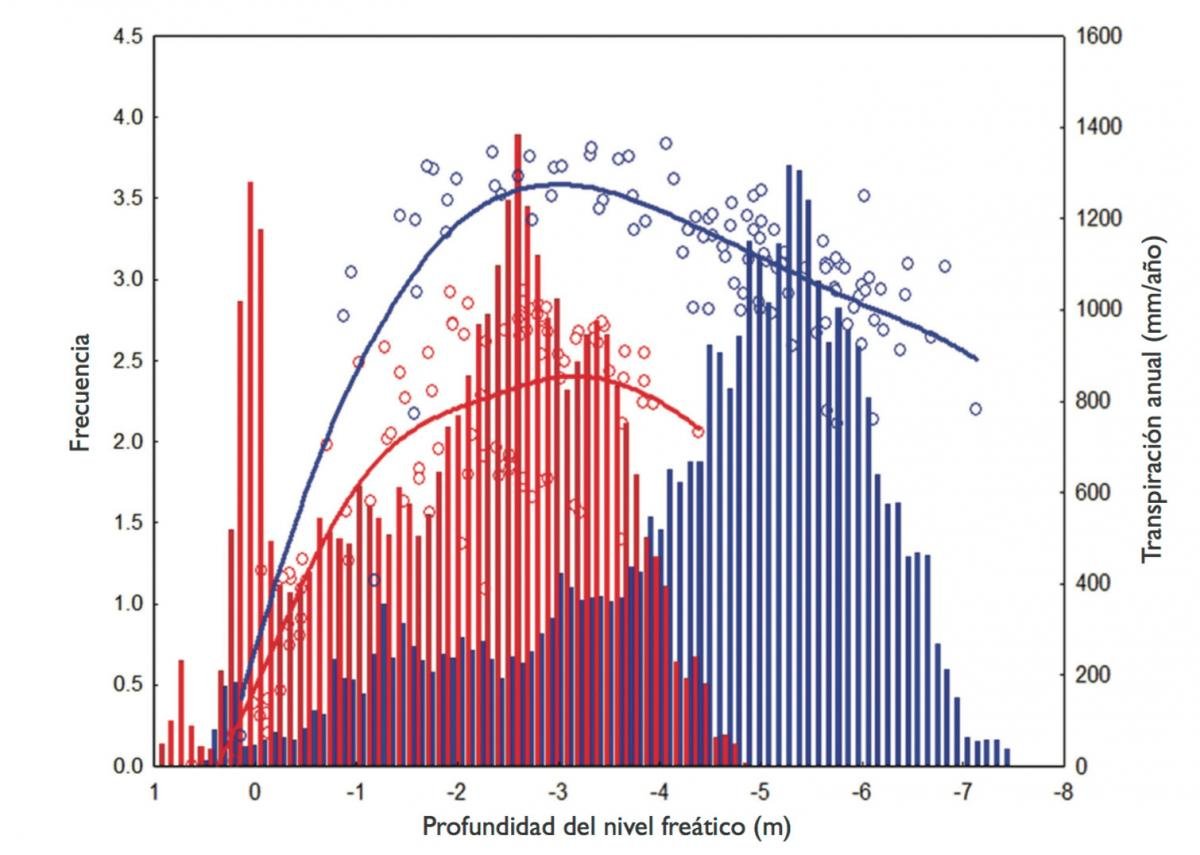 Esta figura muestra las tasas anuales de transpiración en la región pampeana de Argentina (círculos y líneas) para dos usos de la tierra: pasturas perennes de alfalfa, muy difundidas hasta comienzos de la década de 1990 y rotaciones anuales trigo-soja-maíz, predominantes en la actualidad. Las tasas de transpiración (eje de la derecha) son mayores bajo pasturas que bajo cultivos anuales (1200 vs. 800 mm/año, en promedio). Las barras muestran 100 años de simulación de la profundidad del nivel freático bajo estos regímenes de evapotranspiración. La altura de las barras indica la frecuencia con que en estos cien años se alcanza un nivel freático dado (frecuencias, en el eje de la izquierda). El modelo muestra que las pasturas suelen mantener los niveles de agua subterránea a profundidades mayores (promedio -4.4 vs. -2 m) lo que resulta en una menor frecuencia de inundaciones (2 vs. 47 eventos).